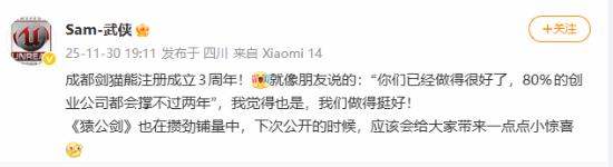 11月30日,国产动作游戏《猿公剑》制作人@Sam-武侠在个人微博账号上发文庆祝团队剑猫熊已成立三周年,并表示游戏会在下次公开时给玩家带来惊喜。