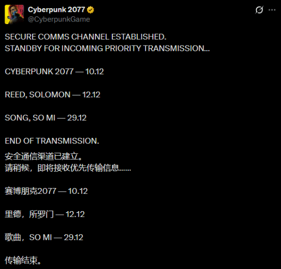 据Insider Gaming报道,《赛博朋克2077》官方发布了一条意味深长的帖子,暗示将在2025年12月10日(也正好是游戏五周年)公布重大情报。在这条推文中,官方并未透露任何具体的内容,但他们以非常隐晦的方式提到了几个值得玩家关注的日期。