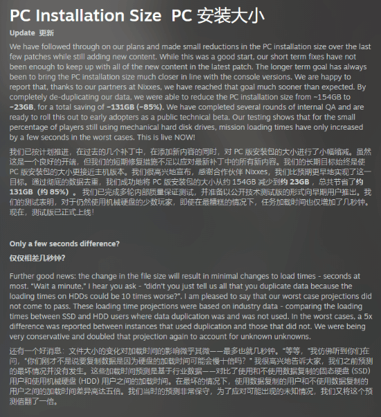 当时,工作室副技术总监解释称,PC端游戏体积之所以这么庞大,主要是因为游戏目前仍兼容机械硬盘(HDD)与固态硬盘(SSD),这意味着为了提升HDD用户的读取速度,游戏需要重复存放大量数据文件。从主机版的安装体积(Xbox大约30G)就能看出,这种“文件重复”占据了极大的空间。