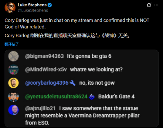 比较主流的观点认为,该雕像可能与《暗黑破坏神4》或《战神》新作有关,但这两种说法分别遭到了彭博社记者、知名业内消息人士Jason Schreier和《战神》系列创意总监Cory Barlog的否认。