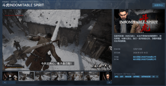 由哈尔滨智云科技开发有限公司开发的抗日题材动作游戏《斗虎》目前已经上架Steam,商店页面显示本作的计划发行日期为2028年9月18日。