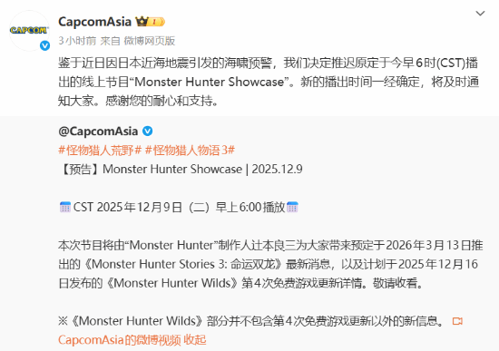 卡普空和《怪物猎人》官方原本计划在今日早晨六点举行“Monster Hunter Showcase”特备直播活动,为大家带来《怪物猎人物语3:命运双龙》以及《怪物猎人:荒野》的最新情报。