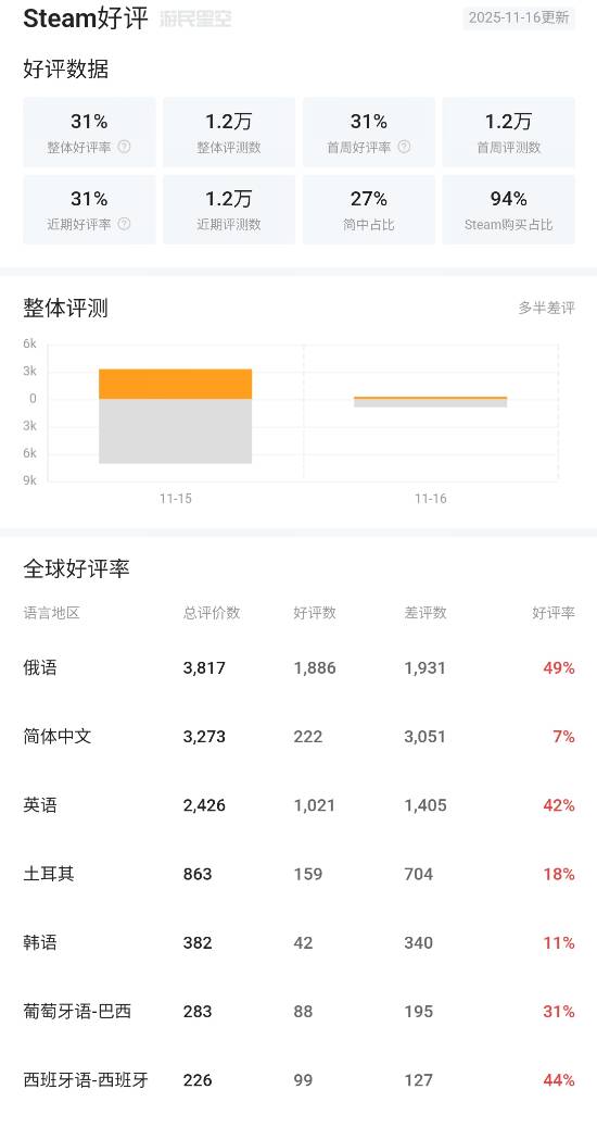 截至发稿前,据我站的数据显示,《逃离塔科夫》在Steam平台的简体中文区评价为“差评如潮”,好评率仅为7%,总体评价为“多半差评”。除此之外,Steam玩家最高在线数近3万人。
