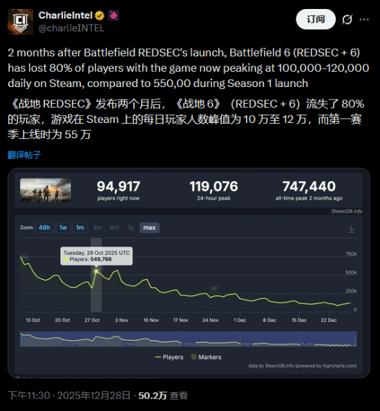 据FPS游戏资讯博主@charlieINTEL分享,《战地6》最近一段时间似乎表现出了“后劲不足”的现象,在其大逃杀模式“禁区冲突”上线两个月之后,游戏在Steam上已经流失了约80%的玩家。