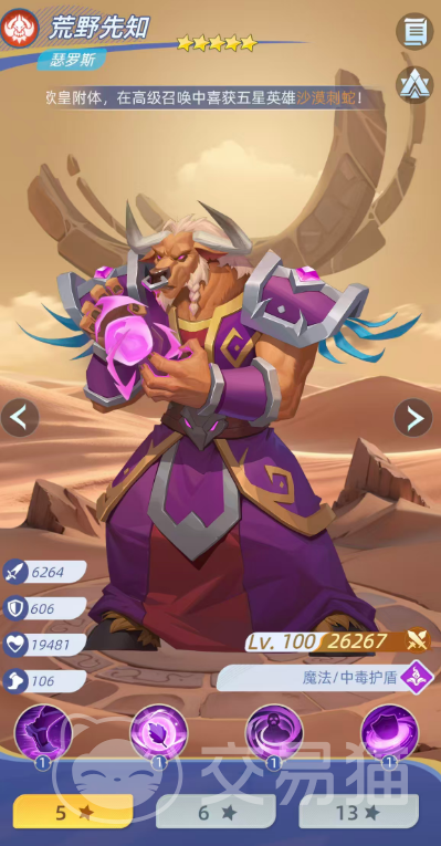 持续伤害维度由荒野先知瑟罗斯承担。其核心机制为中毒叠加,基础技能有40%概率使目标进入中毒状态;当触发伤害提升效果时,总伤害提升至140%,中毒概率同步增至60%,并额外获得40%概率施加“剧毒”效果,同时自身获得伤害提升增益。中毒单位每回合损失相当于其攻击力20%的生命值,配合普攻30%概率附加中毒(优先攻击生命值最低目标),形成高效残局收割链路,对高防御、高血量敌人具备极强软化能力。