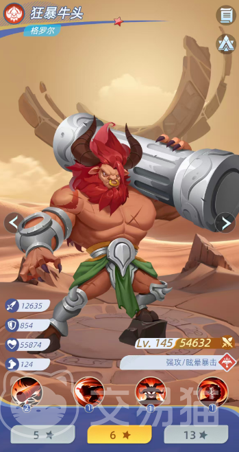 狂暴牛头(格罗尔):后排压制型AOE输出。技能对敌方后排造成203%物理伤害,附带25%眩晕概率;普攻亦有15%概率触发眩晕。当生命值低于50%时,自动激活增益,提升20%暴击率,强化残局收割能力。其战术价值高度依赖眩晕覆盖率与队友协同节奏,需配合控制链延长或爆发衔接体系使用。