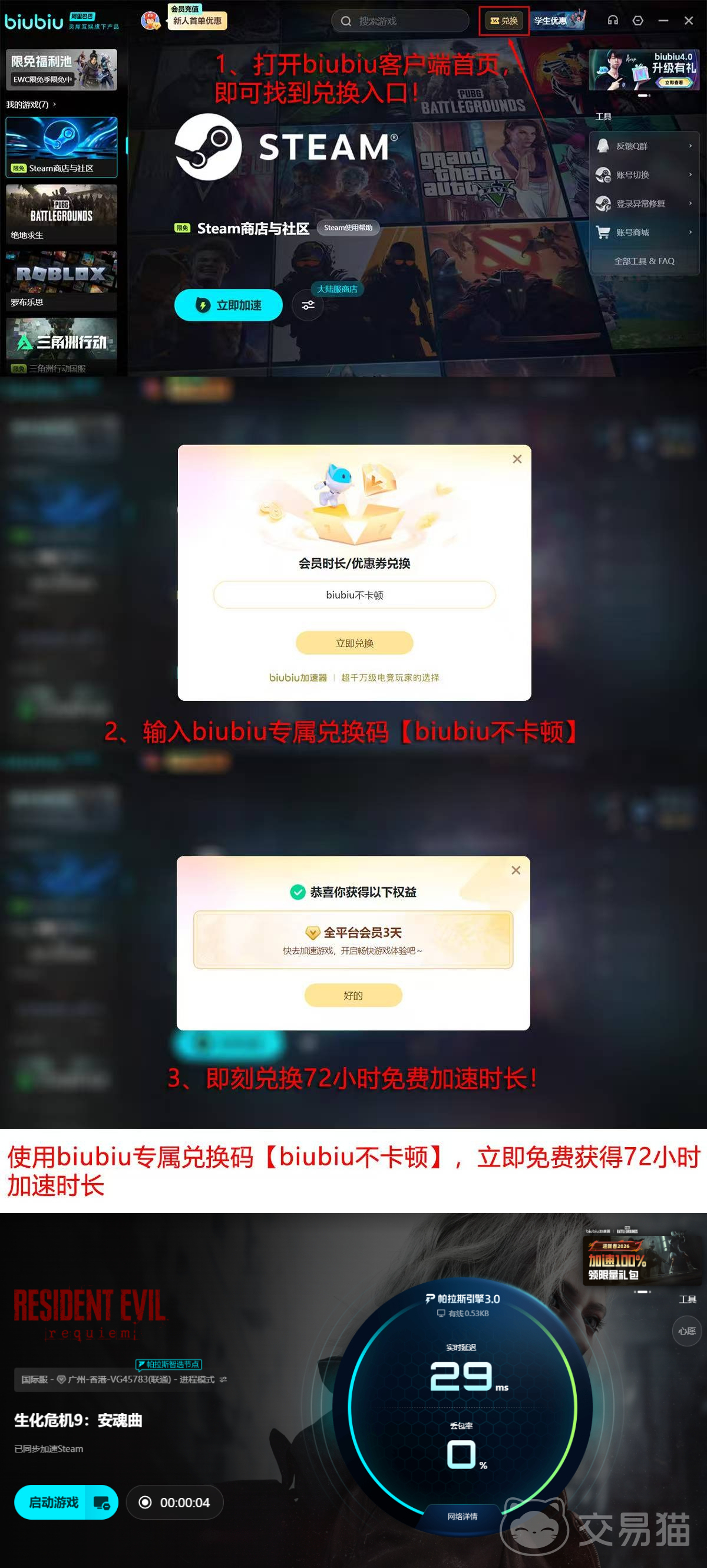 新用户可享受首日24小时全功能试用权益,输入指定激活码还可额外获得72小时加速时长,累计畅玩96小时,保障全程低延迟、高帧率运行体验,从容应对浣熊市终极危机。