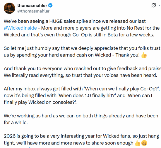 “过去,我的收件箱总是被'我们到底什么时候才能玩到合作模式?'填满,而现在则变成了'1.0版本到底什么时候发布?'和'我到底什么时候才能在主机上玩到《恶意不息》?'目前已经在竭尽全力地推进这两件事,并且已经努力一段时间了。2026年将是充满惊喜的一年,所以请稍安勿躁,我们很快就会有越来越多的消息与大家分享。”