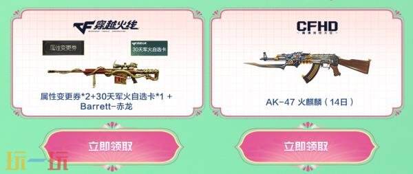 核心道具奖励:Barrett-赤龙、属性变更券*2、30天**自选卡*1、AK-47-火麒麟(14日)(CFHD端奖励)。