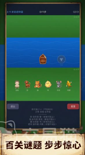 游戏以传统渡河逻辑为核心机制,所有关卡均围绕“在有限载具容量与角色互斥条件下,完成全员安全转移”这一目标展开。玩家需反复推演行动顺序,规避任意违规组合——例如无人看管时狼吃羊、犯人脱离监管、或关键角色被单独留在危险岸侧。虽无战斗、无资源收集、无社交交互,但每一步操作都直指逻辑链条的关键节点。