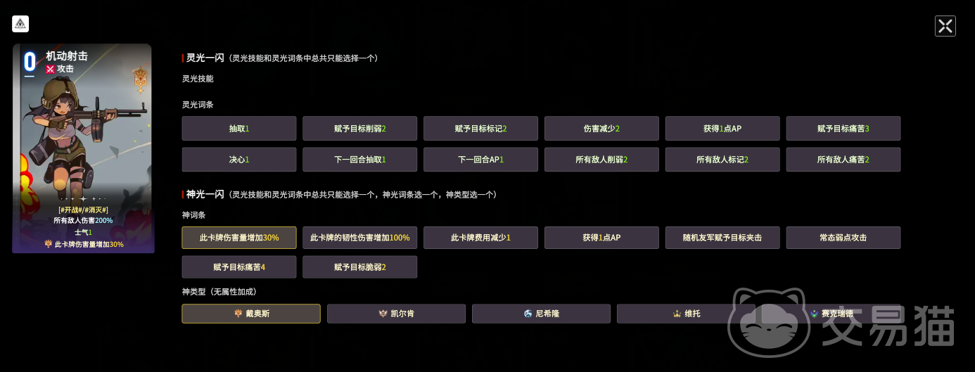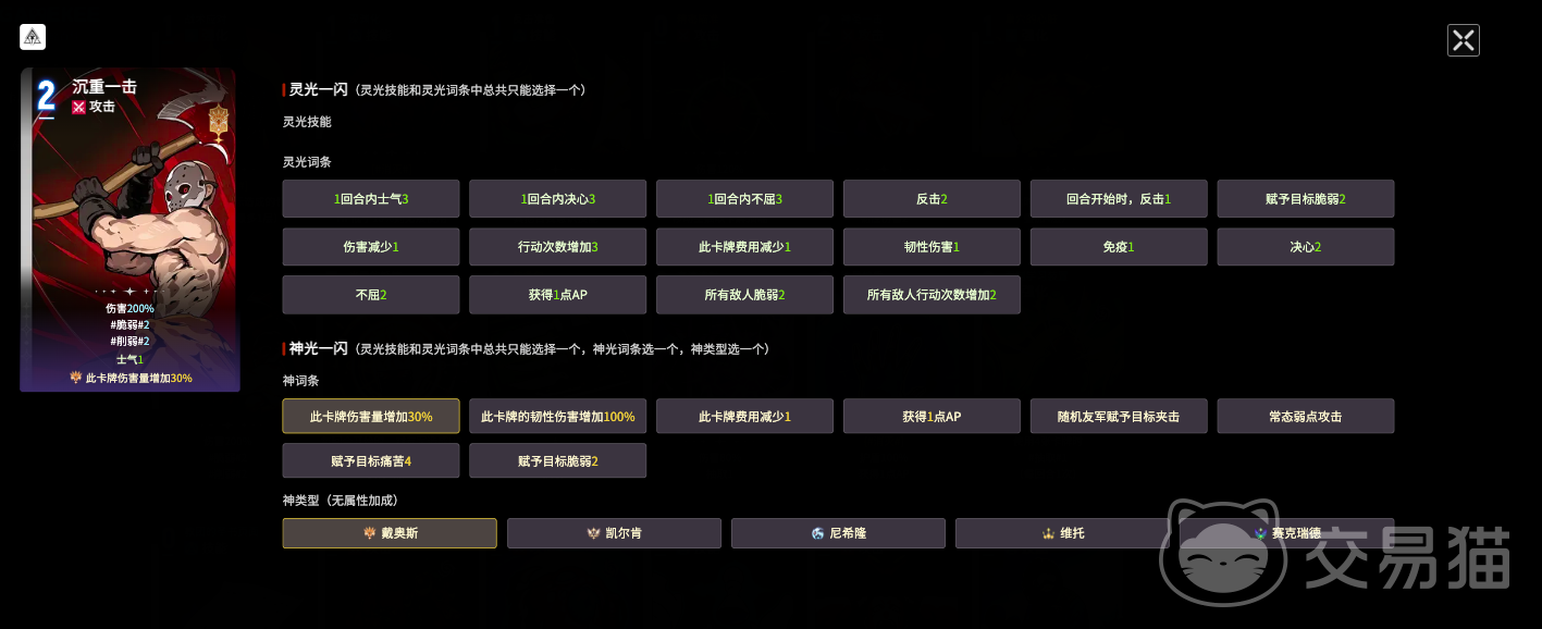 第三张为【沉重一击】。该卡对戴奥斯与尼希隆尤为契合,不仅提供200%基础伤害加成,还能为目标附加2层脆弱与2层虚弱,实现伤害放大与战力削弱双重压制。推荐词条为“获得1点AP”与“卡伤害量增加30%”,前者保障卡组运转效率,后者进一步抬高单次流血阈值,并有助于高频触发连携效果。