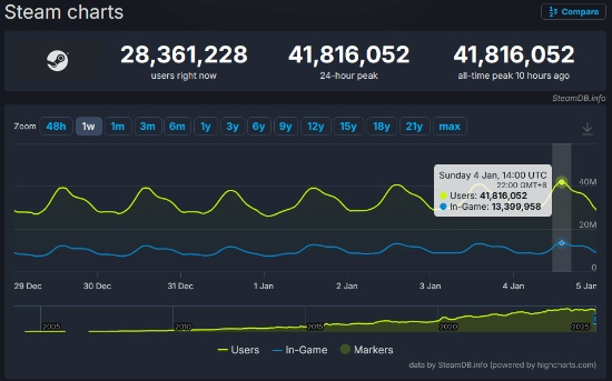 根据Steam数据统计平台SteamDB的数据,当时Steam平台有共计41816052名玩家同时在线,其中,又有13399958名玩家正在游戏当中。
