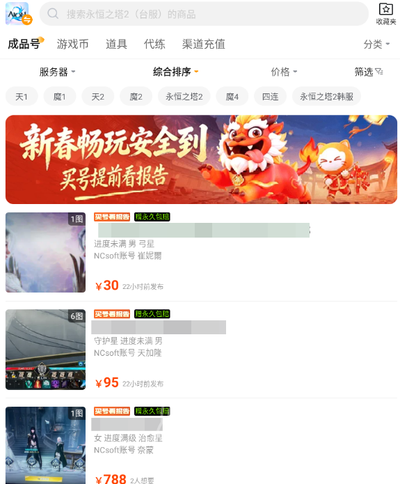 活跃度高、商品更新快是优质交易平台的关键指标。日均上架《永恒之塔》相关账号数量充足,涵盖各等级段、皮肤配置及职业流派,显著提升用户匹配心仪账号的概率。支持实时查看卖家提供的完整账号数据,包括角色等级、装备清单、外观图鉴、历史登录记录等;若选择标注“官方验号”的商品,可同步查阅由平台出具的验号报告,内容含盖实名绑定状态、封禁历史、皮肤归属等关键字段。内置智能筛选工具支持按指定外观、角色名称、价格区间或综合热度排序,浏览效率大幅提升。
