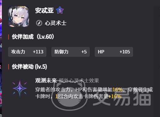 在辅战员搭配方面,优先选择具备普攻增伤能力的角色。安忒亚是当前最优解,其被动可提升穿戴者攻击力、HP及整体伤害16%,同时使本回合内生成的所有攻击类卡牌伤害再 16%,完美适配德雷莎高频产匕首的运作模式。队友配置则侧重行动资源拓展与过牌效率:具备稳定恢复能力的米卡可保障续航,而拥有协同攻击机制的雨果,则能延伸输出链条,共同构建多段高频打击节奏。