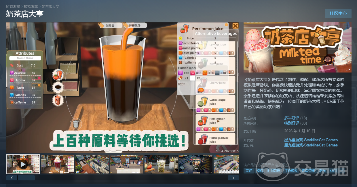 综上所述,《奶茶店大亨》已于2026年1月26日正式发售。其兼具策略性、趣味性与现实映射感的玩法设计,不仅适合模拟经营爱好者,也适合作为了解实体奶茶行业运作逻辑的入门实践工具。若你渴望在低风险环境中锤炼商业直觉与执行能力,这款游戏无疑是值得入手的优质选择。