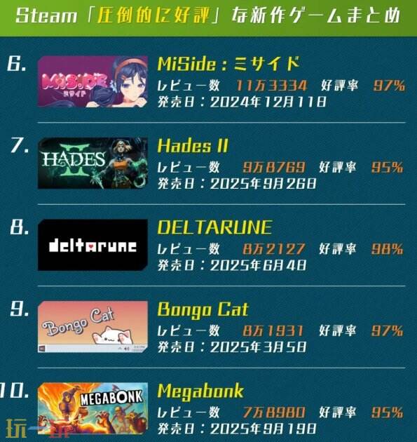 以下是2025年Steam“好评如潮”游戏评论数TOP10榜单(统计周期为2024年12月1日至2025年11月30日):