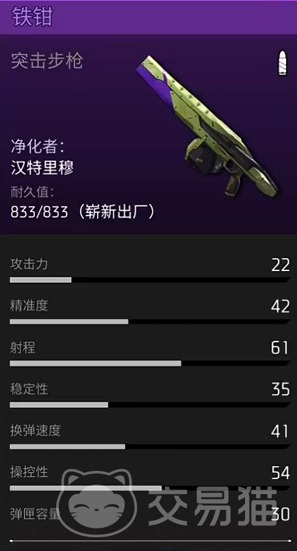 第四款为均衡型突击步枪“铁钳”,精准度达42,攻击能力为22,弹匣容量高达30发。相较“雷霆”,其单次爆发略低,但持续输出能力突出,适用于多波次交火、据点争夺及长时间拉锯战。高容弹量大幅降低换弹频次,在高强度对抗中保障火力不间断,对新手与老手均具备良好兼容性,是泛用性最强的突击步枪之一。