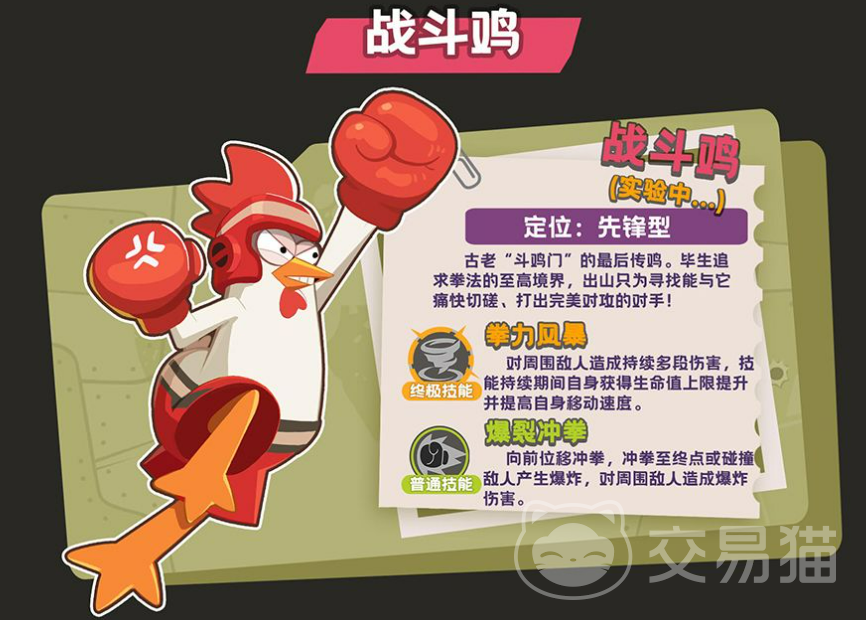 第三位角色战斗鸡,属于高风险高回报的先锋突进型单位。其终极技能“拳力风暴”开启后,不仅对周围敌人造成多段范围伤害,还将同步提升自身最大生命值与移动速度,形成越战越强的正向循环;另一技能“爆裂冲拳”具备直线突进 终点爆炸双重机制,命中目标或抵达路径末端即触发范围伤害,具备极强的先手压制与打断能力。该角色适合擅长预判走位、热衷近身压制的玩家,但需注意其缺乏远程牵制手段,若突进失败易陷入孤立无援境地,因此对战场形势判断与协同意识要求较高。