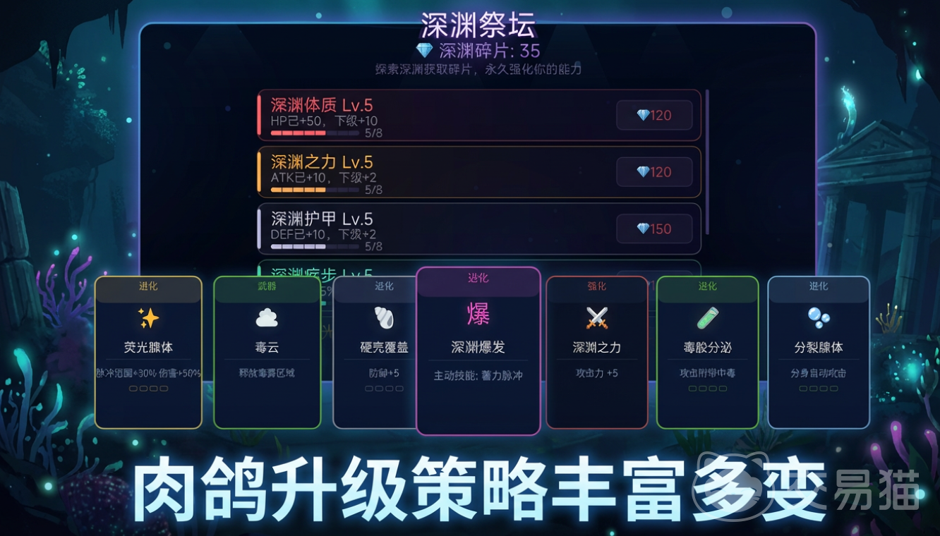 核心玩法强调决策权重:每一次进化分支不仅改变外观与基础属性,更重构战斗逻辑。选择毒素路线后,部分精英敌人会衍生抗性机制;专注荧光脉冲则可能触发特殊环境事件——如激活沉没灯塔引发全图照明,短暂压制阴影系生物。这种强关联性设计,确保百名玩家培育出的深海主宰绝无雷同。
