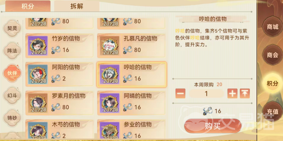 除用于结缘外,信物同样是伙伴后期升阶不可或缺的消耗材料。随着伙伴等级提升与阶位突破,所需信物总量将大幅增加,对玩家的长期资源储备能力提出更高要求。若某位伙伴已不再纳入主力阵容,其对应信物亦可进行拆解,转化为通用货币,用于商城内其他资源的兑换。目前,所有伙伴信物的唯一获取渠道为游戏内“商会”系统——该系统不开放副本掉落、活动直赠等替代路径,确保了信物获取逻辑的统一性与策略性。