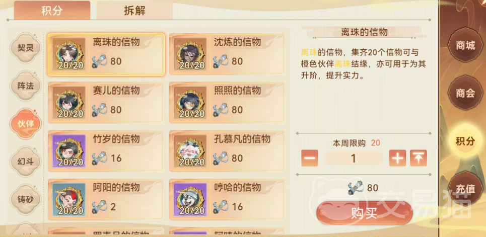 从获取成本维度看,橙色品质伙伴信物为当前最难入手的类型:单枚需消耗80点信物积分。而该积分现阶段获取效率较低,刷新周期长、兑换门槛高,使得橙色信物成为稀缺资源。建议玩家在积分储备充足时,优先兑换橙色信物,以最大化长期战力投入回报率。