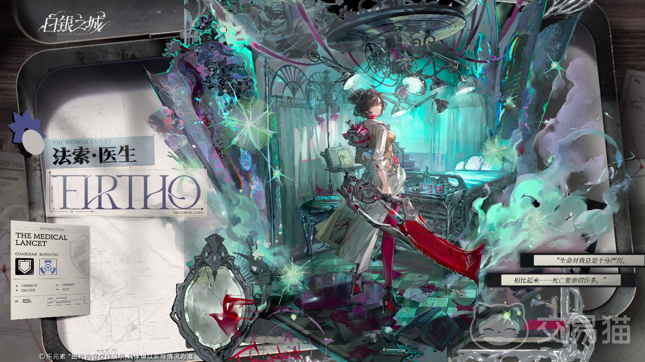第二位是法索医生,一位兼具高治疗输出与战术压制能力的复合型支援角色。她长期驻守于私人诊所密室,专注前沿医学研究,所有技能设计均围绕临床医学概念展开。其战斗机制强调精准打击与状态干预,“长城”为其标志性高伤技能。角色设定中明确存在先天性生理缺陷,依赖外置维生装置维持生命体征;性格上排斥怜悯,抗拒被视作负担,因此深化角色关系的关键路径在于赋予其前线作战职责。