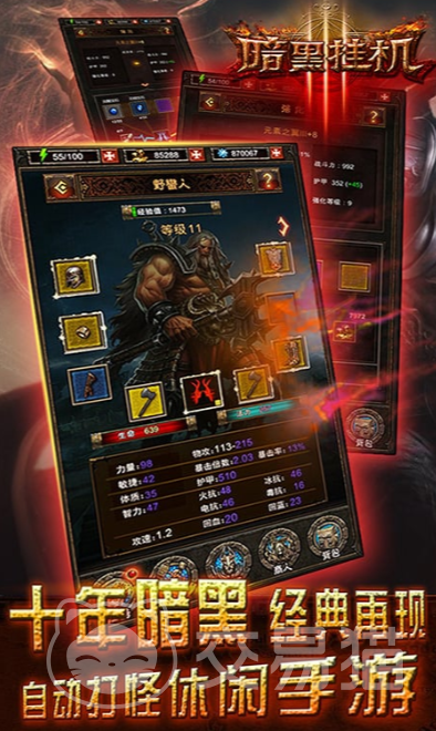 《暗黑挂机》融合经典暗黑题材与轻量化挂机机制,打造兼具深度策略性与休闲自由度的手游新体验。游戏以高饱和魔幻美术风格构建沉浸式世界观,场景光影层次丰富,技能特效具备电影级动态表现力,玩家将在诡谲幽邃的暗黑大陆中展开探索、战斗与成长之旅。