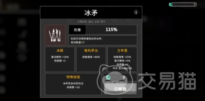 起手配置无需过度调整:主武器推荐奥伯龙,其附带的飞雷神效果可大幅提升位移灵活性,便于持续风筝输出;宠物选用救生员,Boss战中可生成两层临时护盾,大幅增强容错率;增益类技能直接沿用系统预设的冥想,无需额外解锁,稳定提供基础战力加成。核心输出技“冰剑”的解锁流程具有唯一性,必须严格遵循——首步需获取“冰矛”道具,该道具通过第3章连续三次通关骷髅Boss(期间不可被骷髅兵击中)获得。