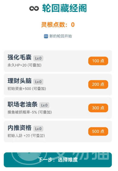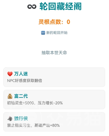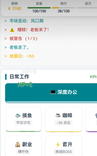 界面设计延续极简风格,核心操作依托清晰选项菜单展开。工作产出可转化为灵石收益,用于购置功法秘籍、炼制法宝、租用洞府或兑换闭关时间;而连续加班可能触发“走火入魔”事件,需消耗丹药调息恢复,进一步强化修真逻辑与职场节奏的深度绑定。