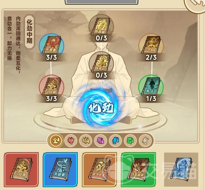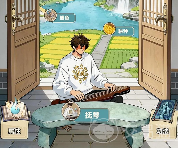 琴房为特色静修空间,抚琴可提升功法领悟效率;琴房毗邻池塘与农田,支持垂钓、耕种等轻度交互行为,产出资源直接用于功法研习。功法体系按白、绿、蓝、紫、橙五档稀有度划分,集齐指定组合功法密卷后可触发“化劲”机制,大幅提升基础属性上限,并激活专属战斗特效。此外,擂台系统提供实时PVP切磋环境,验证修炼成果。
