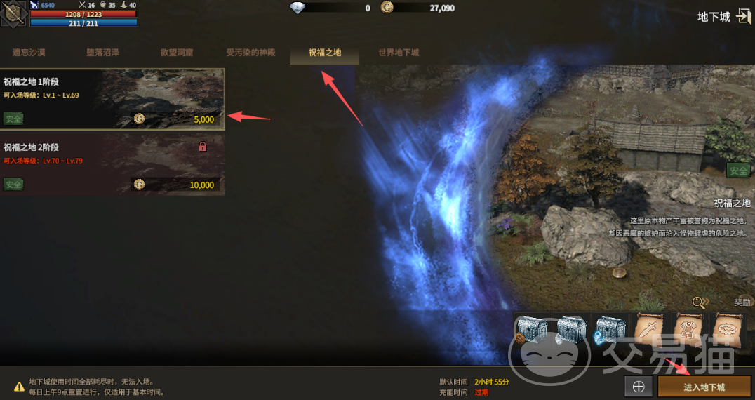 完成补给后,点击界面右上角菜单按钮,进入【地下城】系统。在可选地图列表中,选择【祝福之地】——该区域专为等级提升设计,单位时间经验产出显著高于常规野外地图,是当前阶段最优经验来源。