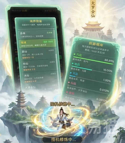 本作融合挂机、修真养成、宗门经营、弟子培养、装备炼化、灵矿开采等多元玩法。开局即享高自由度抽卡体验,一套“永恒”品质核心配置即可支撑中前期稳定发育;NPC弟子按天级、地级、玄级划分资质,可编队上阵并穿戴专属法宝;修炼体系涵盖境界突破、功法研习、灵脉淬炼等传统修真要素,内容密度高且逻辑自洽。
