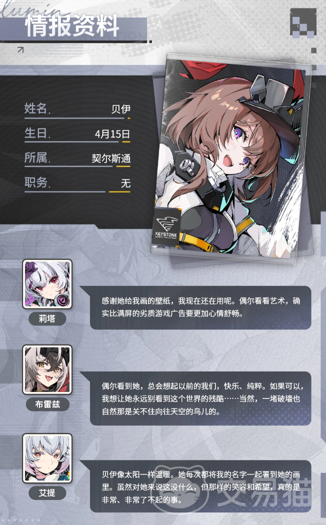 贝伊不仅是契尔斯通先锋勘测小队的一线执行者,更是绿梦时空之声世界观中“希望可被实践”的符号化表达。她以测绘足迹拓展人类认知疆域,以画笔保存文明火种,以战斗姿态捍卫重建权利——在侵蚀尚未退散的当下,用具体行动验证信念的可行性。她是锋刃,亦是微光;是前线最迅捷的突袭者,也是精神维度上最沉静的守望者。