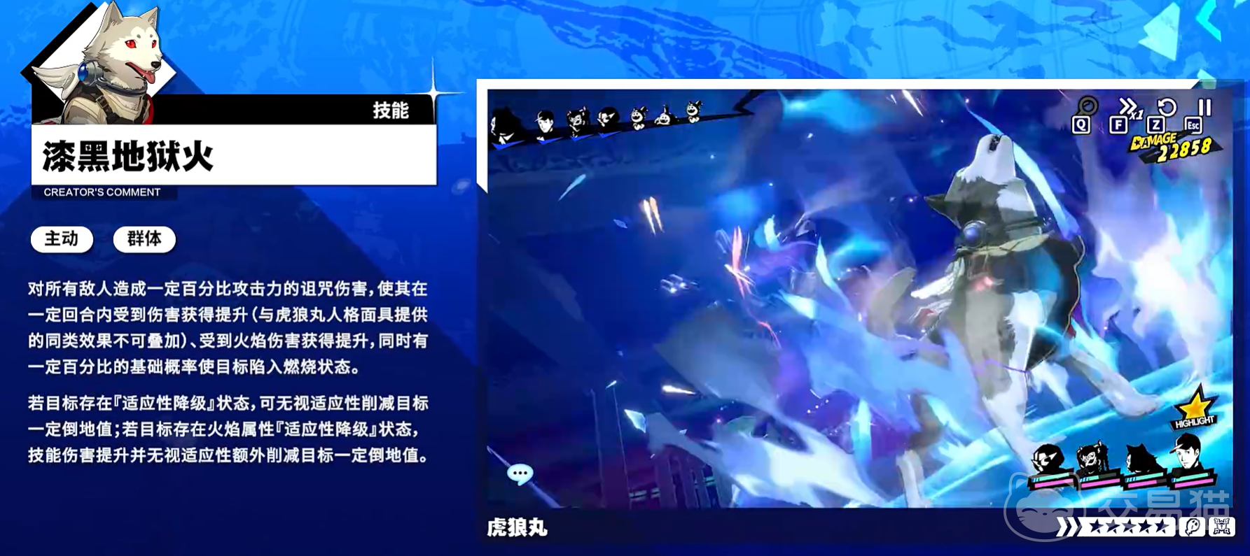 虎狼丸拥有三式群体主动技能:“漆黑地狱火”(火焰属性)、“红闪击”(电击属性)、“银之月霜”(冰冻属性),均造成全体诅咒伤害,并附加持续数回合的“易伤”效果——即提升目标所受全类型伤害及对应属性伤害,同时有概率施加烧伤、触电、冻结状态。三项技能共通机制为:当目标处于“适应性降级”状态时,可无视常规抗性判定直接削减倒地值;若目标已存在对应属性的适应性降级,则技能伤害与倒地值削减量均获得额外提升。因此,该技能组的实际覆盖率与压制效率高度依赖“灵魂追猎”状态的前置铺垫。