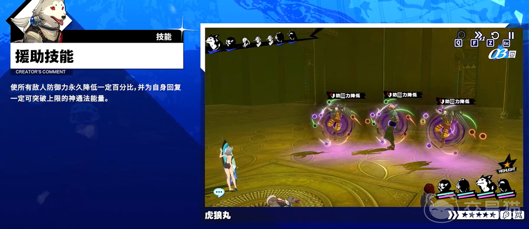 战斗开始时,玩家需手动指定一名队友作为饲主,该操作不可跳过。完成绑定后,虎狼丸将立即释放援助技能,并进入全程跟随饲主行动的状态。若饲主属于S.E.E.S.阵营成员,则饲主可在自身援助技能栏中主动调用虎狼丸的技能,且此操作不影响饲主后续使用其他援助指令,实质上拓展了单回合内的策略选择维度;若饲主非S.E.E.S.成员,则虎狼丸将在饲主回合起始阶段,依据饲主当前属性自动匹配并释放对应技能,表现为高自动化协同模式。值得注意的是,尽管虎狼丸无独立回合,但其所有触发类效果(如回合开始/结束时的增益或状态施加)均正常生效,不存在机制性遗漏。