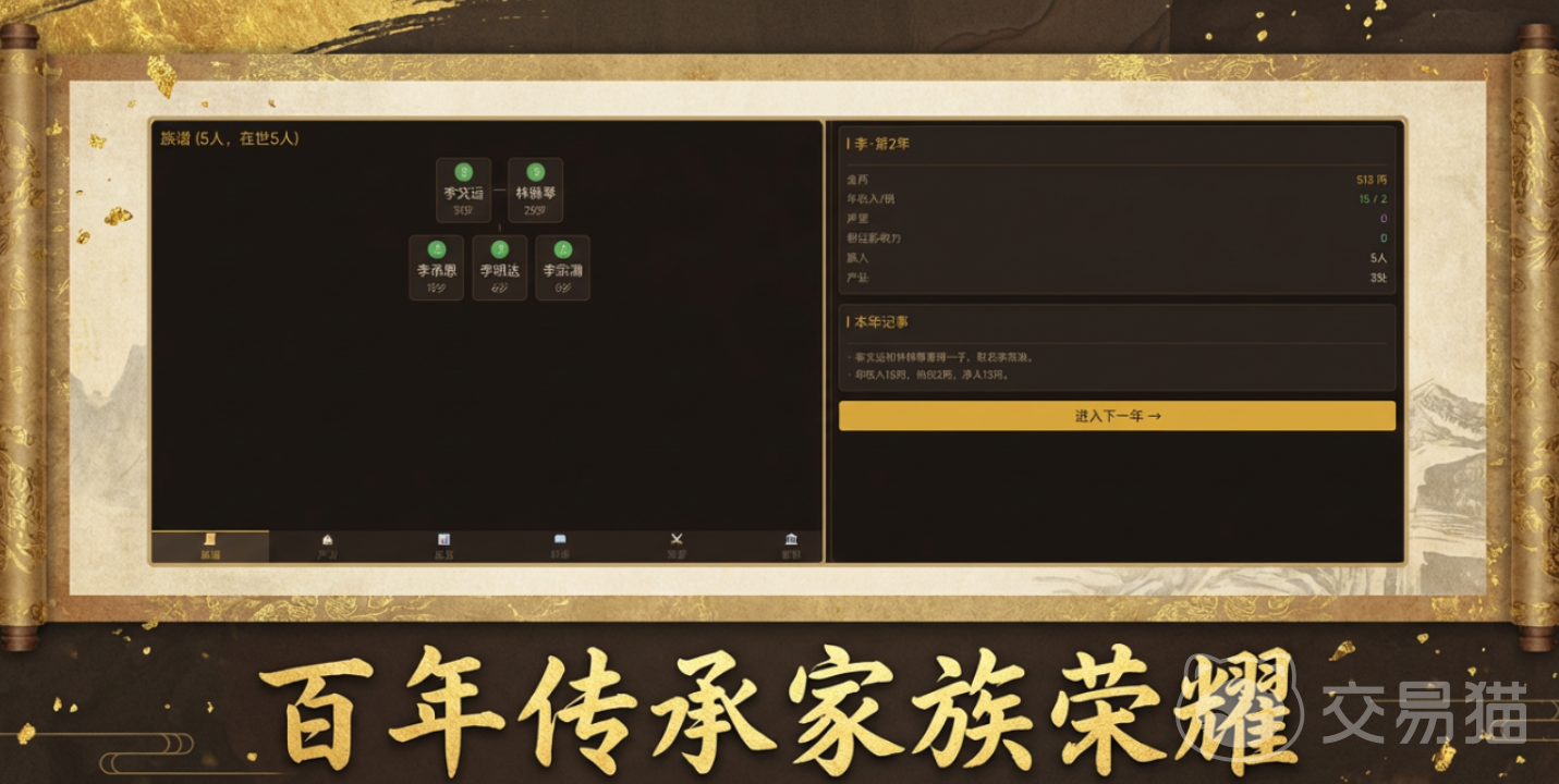 游戏采用多维成长体系:玩家起始于一对夫妇,通过联姻扩大家族网络,借科举提升仕途阶品,凭军功获取封地与兵权,靠经商拓展产业版图。每位家族成员拥有独立属性、寿命、志向与际遇,其决策与命运共同塑造整个世家的发展轨迹。这种“非单主角、全族共营”的设计,显著区别于常规角色扮演类作品,强化了策略纵深与代际传承感。