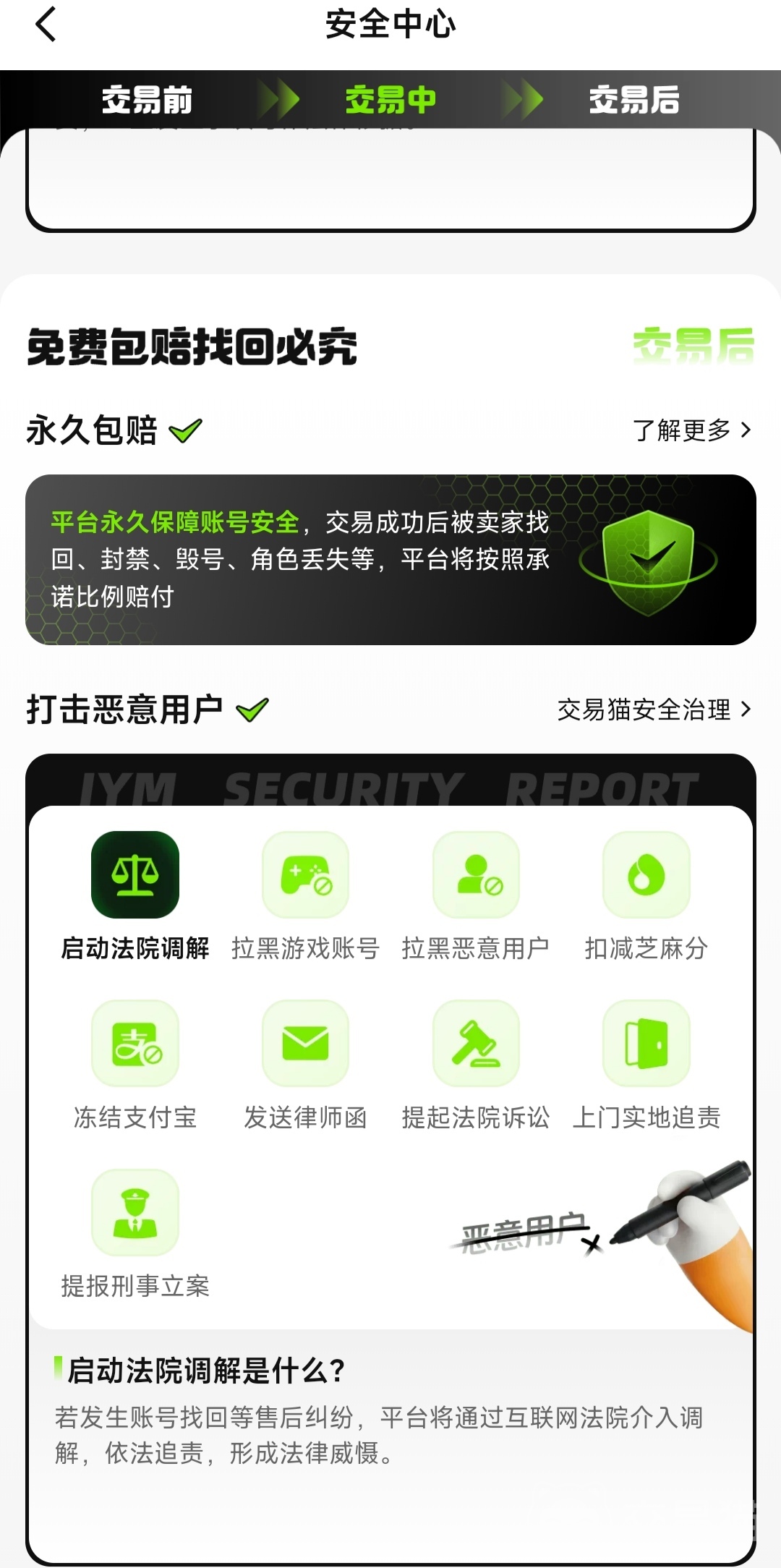 在平台找到心仪的账号后完全可以放心购买,因为有着市面上最靠谱的“永久包赔”服务。而且为了打击那些恶意用户,平台还有一系列流程来确保交易的安全与透明。这其中让大家非常心安的就是,平台会通过互联网法院介入调解售后纠纷并依法追责,这对恶意用户形成威慑的同时也保护了正常用户的合法权益。诸如和平精英这种用户体量非常大的游戏,不可避免的会有一些动了歪心思的人想通过买卖账号来“捞一笔”,但是在成体系的安全壁垒之下,就能够最大程度地保障买卖双方的合法利益。