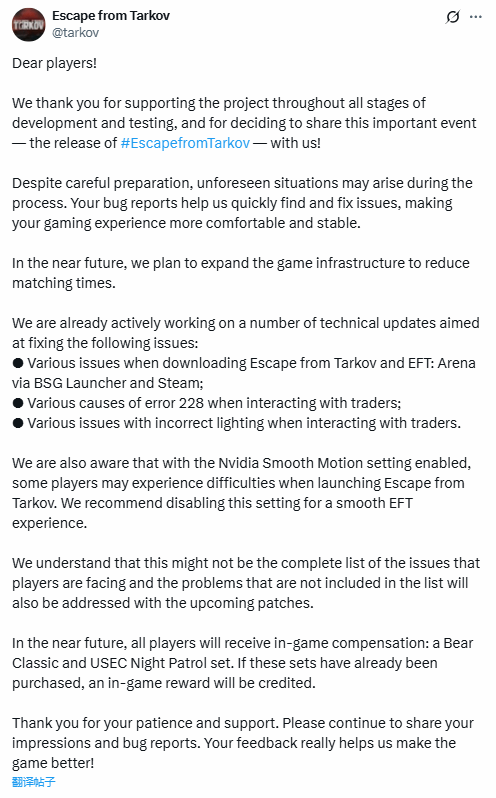 面对突发状况,Battlestate Games立即发文致歉,并启动了应对措施: