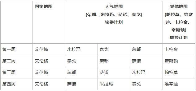 ※当地图阵容中包含帝斯顿时,该周所有地图的匹配概率都为20%。此外的第2、4周的固定地图与人气地图的匹配概率各为22%,其他地图的匹配概率为11%。