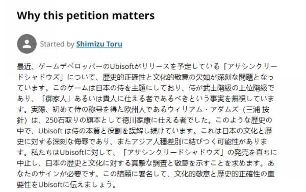 请愿书中写道:“最近,游戏开发商育碧计划推出的《刺客信条:影》,在历史准确性和文化尊重方面存在严重问题。这款游戏以日本武士为主题,忽视了武士阶级应是侍奉御家人或贵人的上级阶层这一事实。实际上,首位获得武士称号的欧洲人威廉·亚当斯(三浦按针)是作为250石俸禄的旗本(指战场上主将旗下的近卫武士)侍奉德川家康的。在这样的历史背景下,育碧继续误解武士的本质和角色,这是对日本文化和历史的严重侮辱,并可能引发对亚洲人的种族歧视。”)