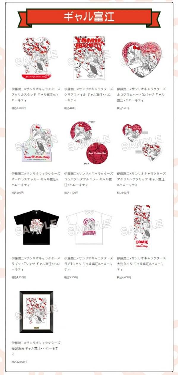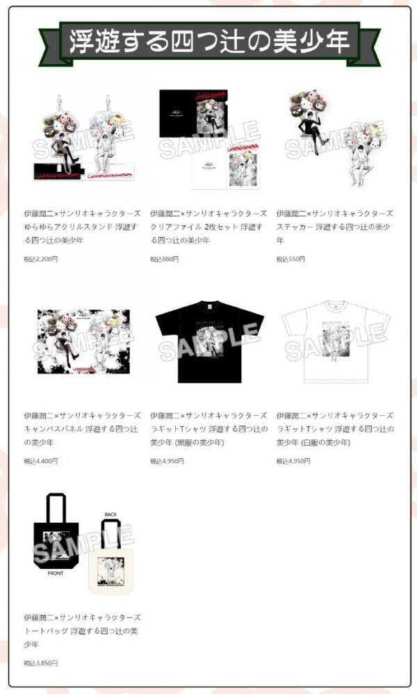 伊藤润二 x 三丽鸥联动快闪店,定于8月23日及9月27日分别在日本东京及大阪开幕。期间将发售以富江、十字路口的美少年与三丽鸥经典角色为主题的亚克力立牌、文件夹、徽章、T恤以及贴纸等周边产品。