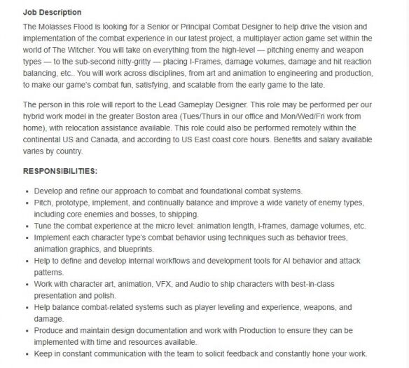 节选:“The Molasses Flood正在寻找一名高级或首席战斗设计师,以帮助推动我们最新项目中的战斗体验的愿景和执行,这是一款以《巫师》为背景的多人动作游戏。您将负责从高层次--投掷敌人和武器类型--到次要的细枝末节--放置I-Frames、伤害量、伤害和命中反应平衡等一切工作。你将跨领域工作,从美术和动画到工程和制作,使我们的游戏战斗有趣,令人满意,并能从游戏初期扩展到游戏后期。”