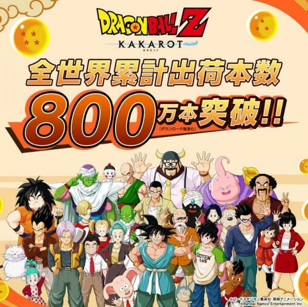 万代南梦宫娱乐宣布,动作角色扮演游戏《七龙珠Z:卡卡洛特》(PS5 / PS4 / Xbox Series X|S / Xbox One / Switch / Steam)全球累计出货套数已突破800万套。经过4年多的销售,如今终于突破800万套出货量的里程碑,仅次于《七龙珠异战2》和《七龙珠FighterZ》的1000万套。