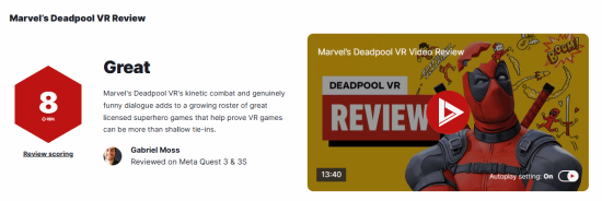 《漫威死侍VR》是一款由Twisted Pixel负责制作发行的VR游戏,基于漫威旗下人气角色死侍创作。IGN发布了本作的评测文章,并给出8分的成绩。简评称,《漫威死侍VR》的动态战斗系统和有趣的对话台词,让越来越多的优质超级英雄游戏再添佳作,证明了VR游戏不仅仅是浅层的联动。