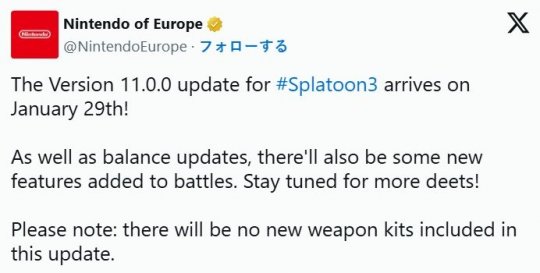 任天堂于1月13日宣布,将于1月29日发布《斯普拉遁3》的大型更新Ver.11.0.0。据称本次更新将包含平衡性调整及部分系统变更,而根据欧洲任天堂的公告,此次更新还将追加“新功能”。