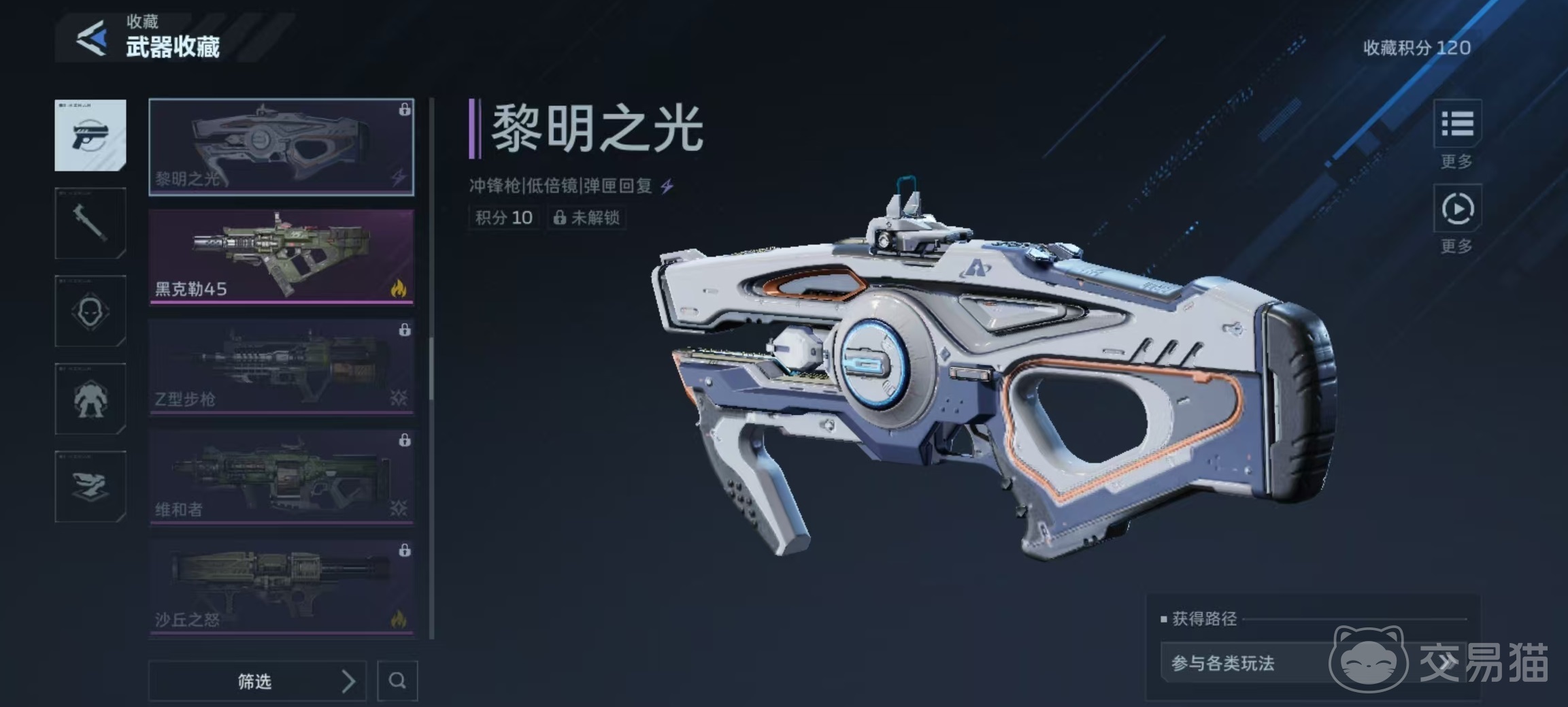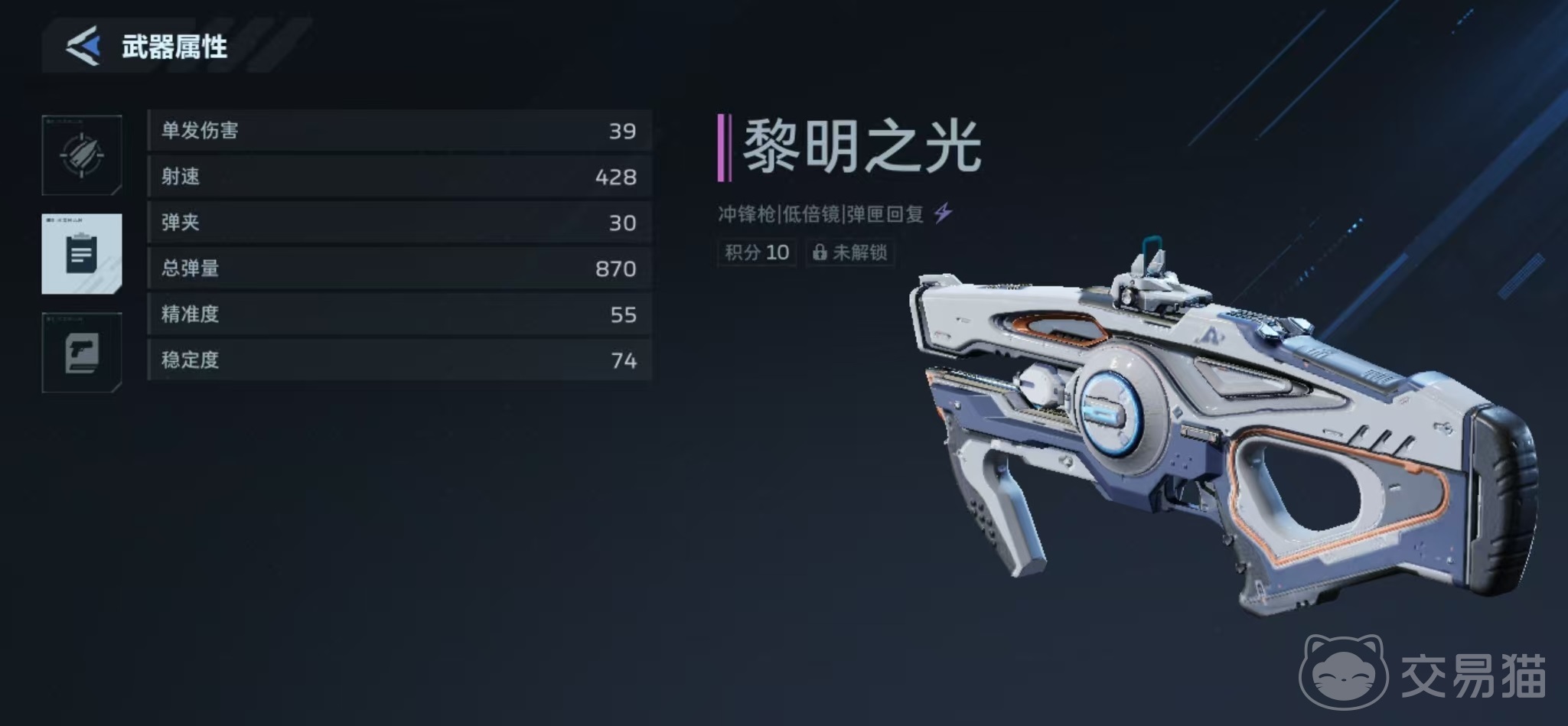 黎明之光是一把紫色品质冲锋枪,获取路径多元:可通过常规玩法任务积累资源兑换,也可通过开启钛金密藏随机获得,获取后即时解锁,无需额外培养周期。其定位兼顾灵活性与持续作战能力,基础属性为单发伤害39点、射速428发/分钟、弹匣容量30发、总备弹量870发,精准度55、稳定度74。轻量化无枪托结构显著优化了后坐力控制,尤其在中近距离持续扫射时表现稳健。