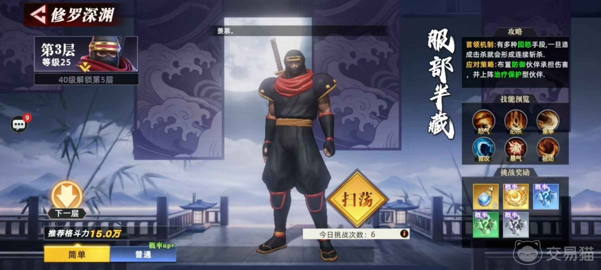 参与方式极为便捷:前往地图中定位NPC服部半藏,与其对话即可直接开启修罗深渊入口。该活动采用逐层递进式挑战结构,每层均设固定守关Boss,并附带专属机制说明。玩家可在进入前查阅各层Boss技能特性与行为模式,从而提前规划阵容与站位。当前开放层数如下:第1层与第2层Boss均为霸王丸;第3层为服部半藏;第4层为天草四郎时贞。后续层数随角色等级逐步解锁,例如第5层需角色达到40级方可开启,更高层数亦遵循相同等级门槛规则。