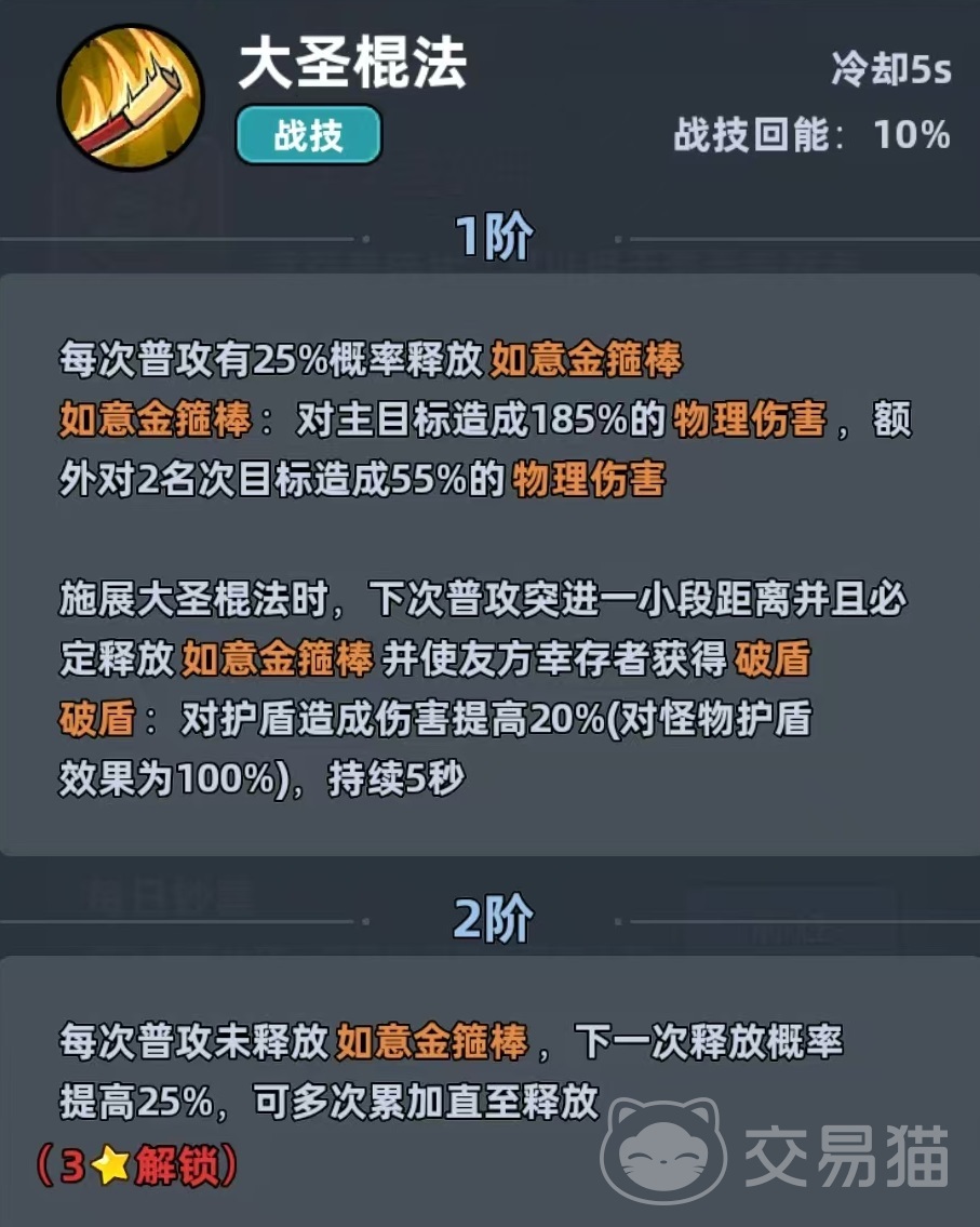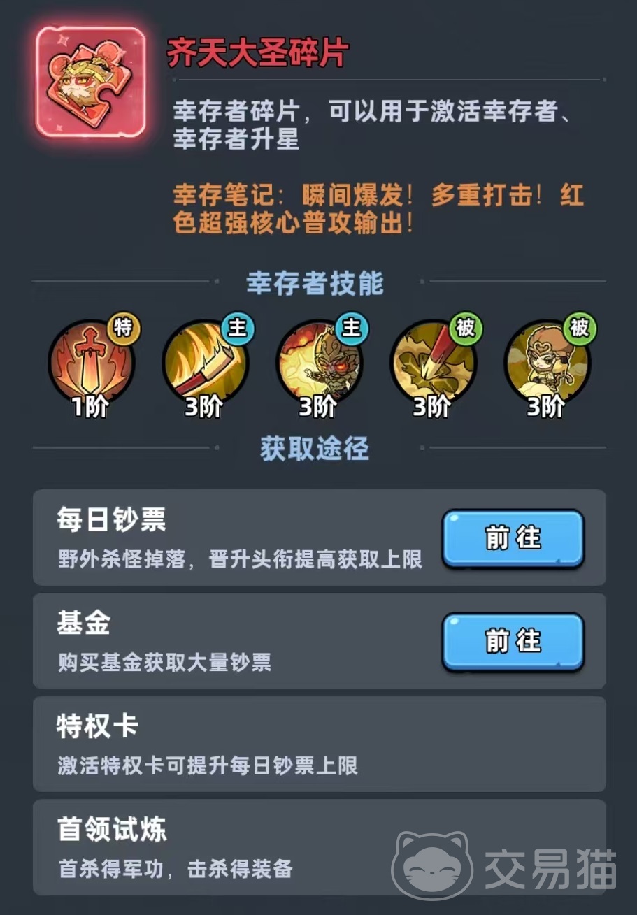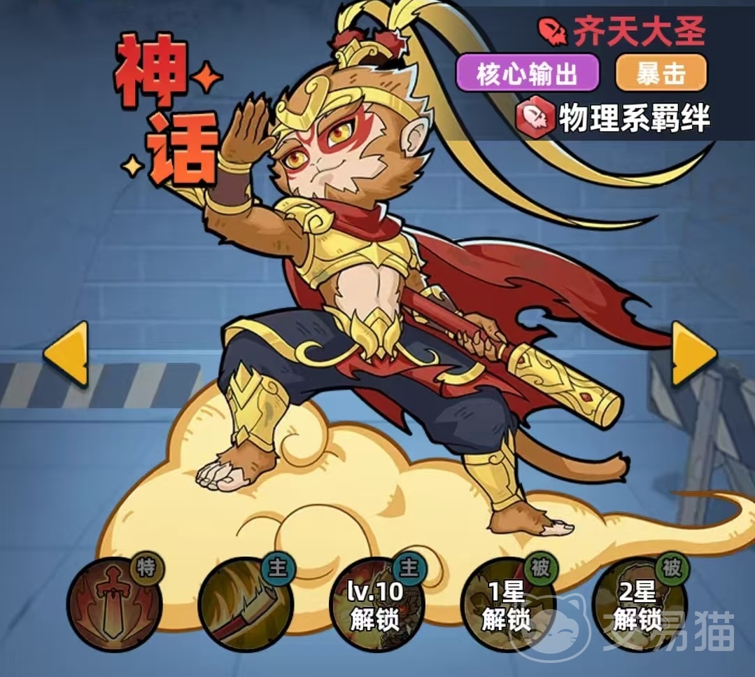 齐天大圣归属于物理系羁绊体系,定位为团队主C,核心优势集中于暴击率与暴击伤害的双重压制能力。其碎片获取渠道丰富,涵盖每日钞票奖励、基金返还、特权卡兑换等常规途径,降低了资源门槛,使中低投入玩家也能实现稳定养成。主动技能“大圣棍法”具备多重战术价值:普通攻击有概率触发如意金箍棒,对主目标造成高额物理伤害,并额外溅射至两个相邻单位;释放该技能时,下一次普攻将附带短距离突进效果,且必定触发如意金箍棒,同时为全体幸存者施加破盾状态,显著提升团队对护盾型敌人的压制效率。