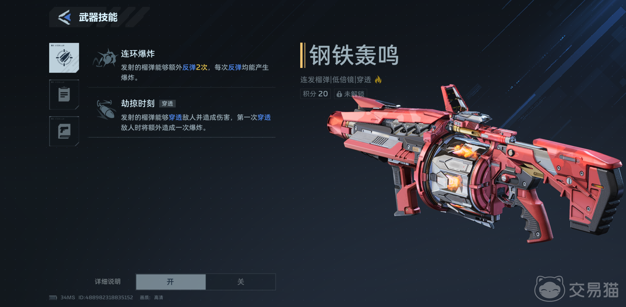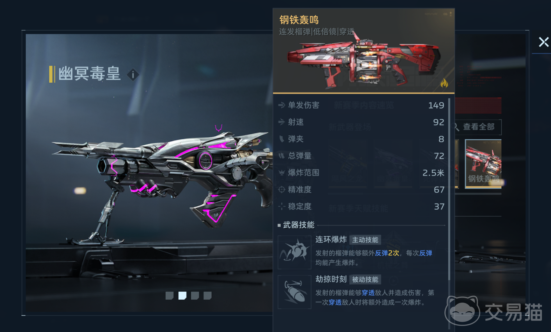 从机制设计来看,“钢铁轰鸣”主打元素穿透与范围反馈:主动技能可反弹榴莲弹,并在每次反弹时触发一次小范围火元素爆炸;被动效果则赋予子弹穿透能力,对首个被穿透目标额外施加一次爆发性元素伤害。整体定位偏向中远距离持续压制,但单发基础伤害与弹匣容量相对有限,因此配件搭配需重点强化输出效率与续航能力。