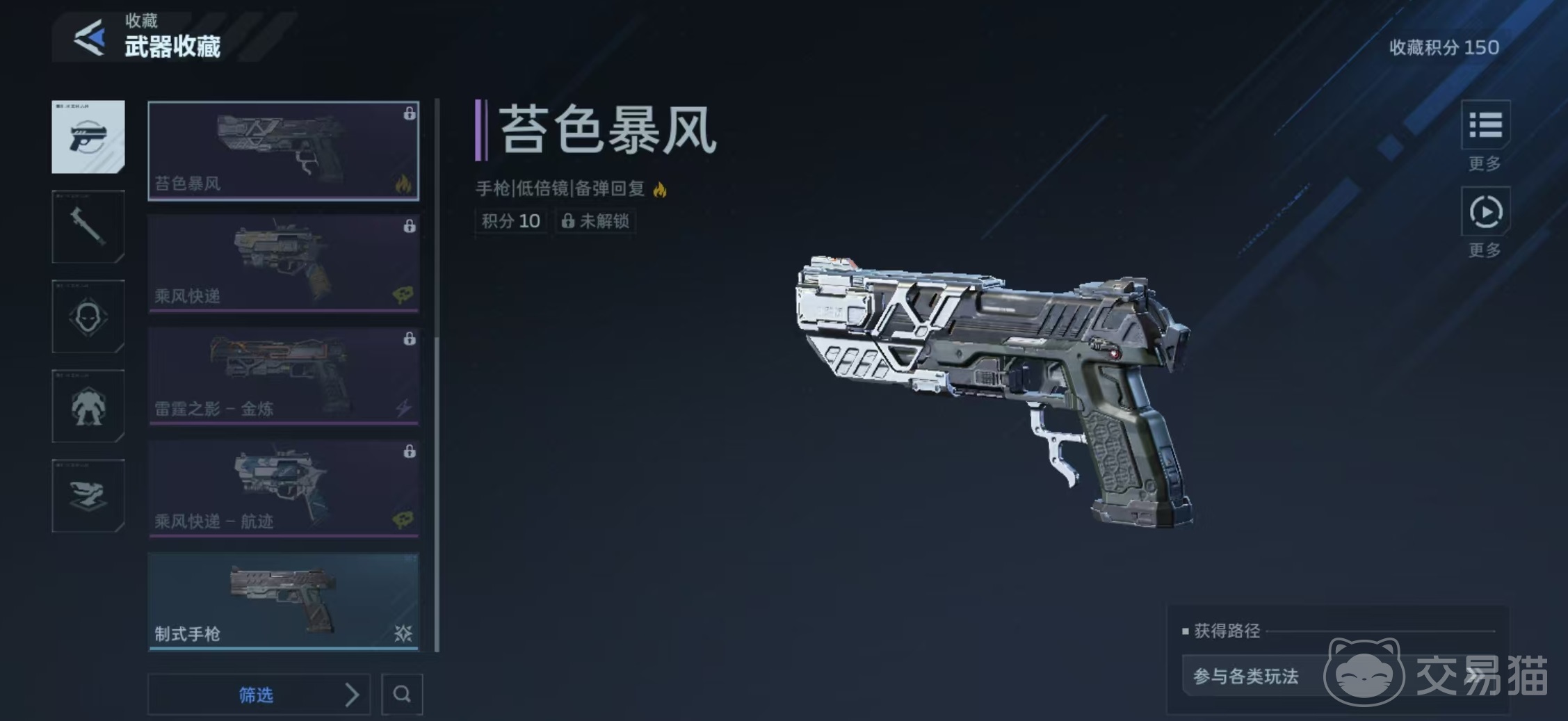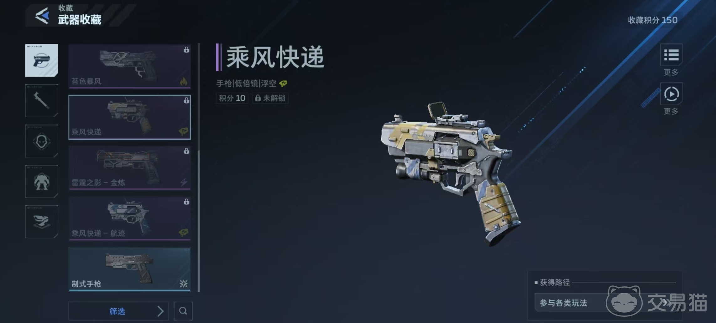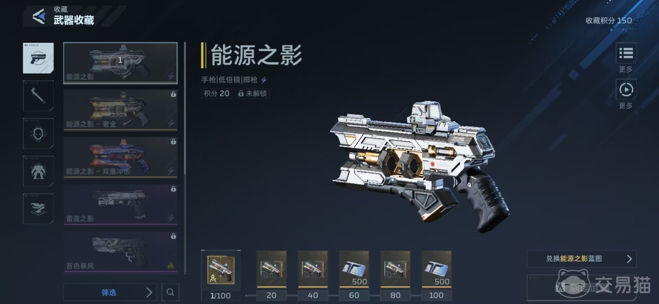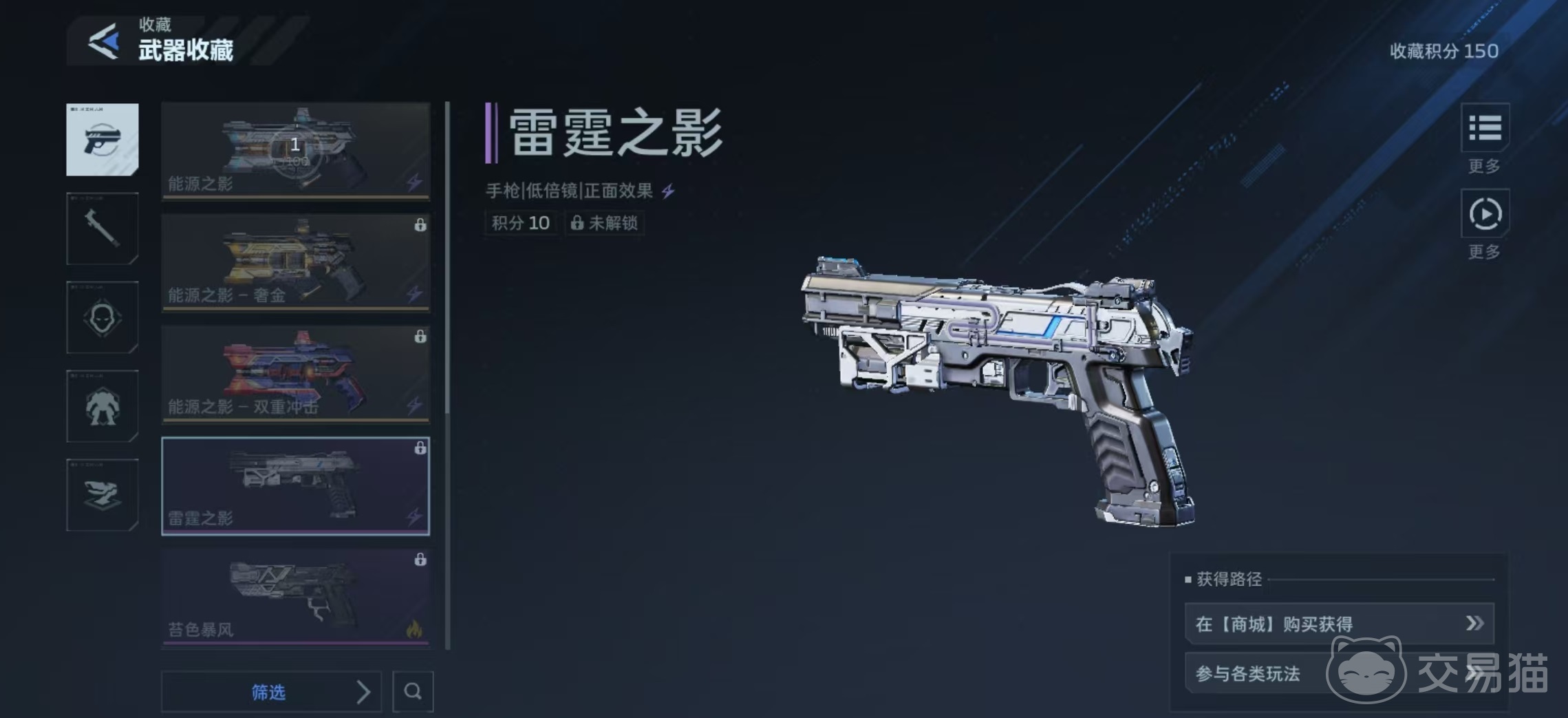 目前游戏中实装的手枪共四款,分别为能源之影、雷霆之影、苔色风暴与乘风快递。其中,能源之影为传说品质手枪,是当前综合强度最高、泛用性最广的选择。该武器提供两套外观皮肤——奢金与双重冲击,但所有皮肤均不改变其核心属性与技能效果,仅作视觉区分。